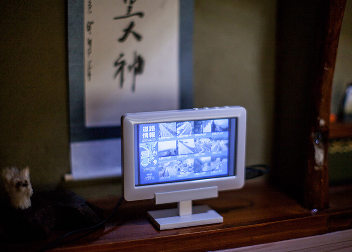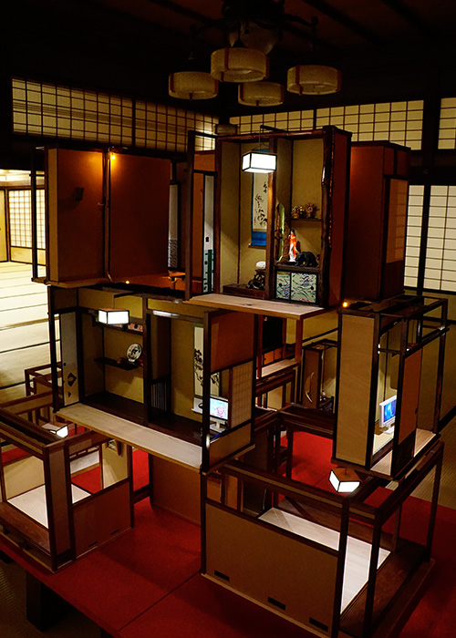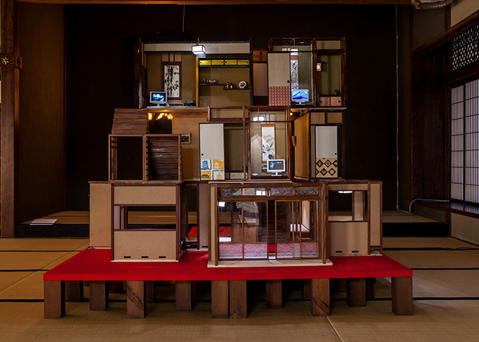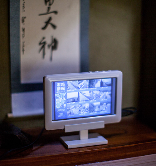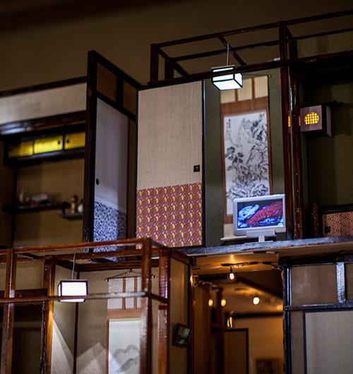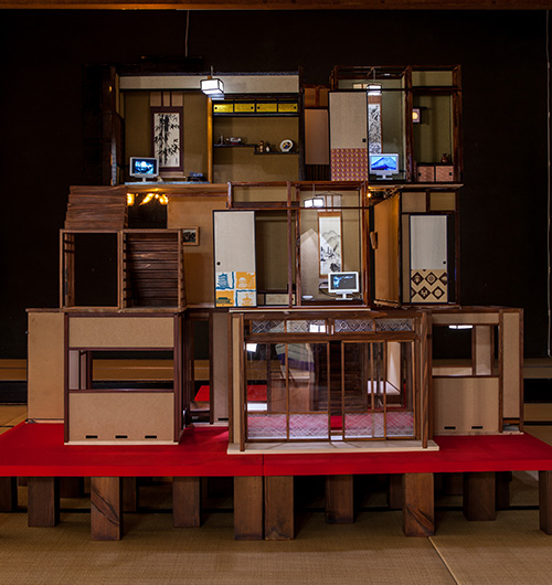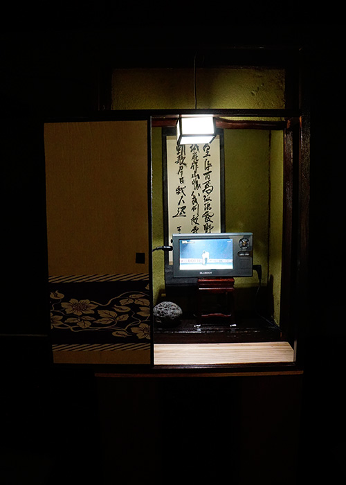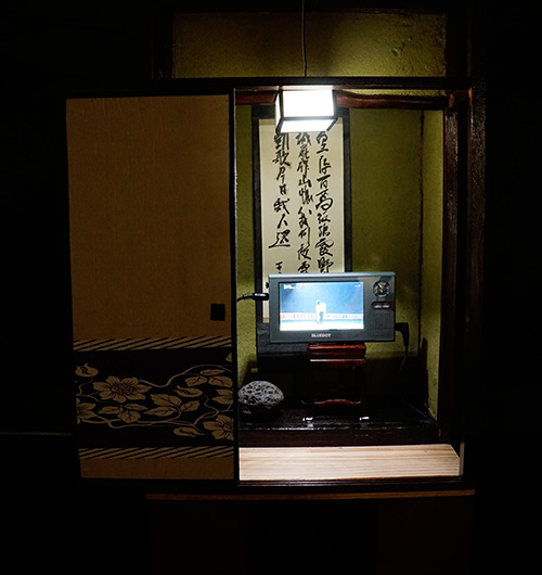 After a day’s walking, I check in at an inn, eat dried pickled-plum Served with tea. Then, changing into a shabby kimono, go to the hot spring with a towel with the inn’s logo on it. I watch local TV programs eating a conbinient store lunch with Canned beer. I also see on the screen dully while the scenery of the station square or the crossing of the mainstreet sent from the fixed cameras are displayed at regular intervals. The laghters from the next room mixed with the sounds of The television reach my ears. Ai suddenly come to know, then, this is a structure where many box type private spaces piled up. This series of works shows the image which occurred to my mind then, that of “the Night INN.