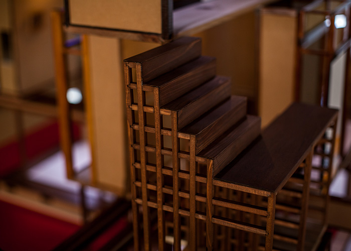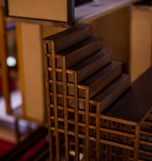 歩き疲れて宿に入りお茶を淹れて、茶菓子の干し梅を食べる。ぺなぺなの浴衣に着替え、宿名の入ったタオルを持って風呂へ行く。コンビニ弁当と缶ビールを飲みながらローカル番組を見る。定期的に駅前や大通り交差点の定点カメラの映像が流れるのを、ぼーっと見る。薄壁を隔てた隣室からもテレビの音に混じって笑い声が聞こえる。 そういう時にふと、ここが極私的な箱形空間が積み重なった構造体であることに気付かされる。これはその時、頭に浮かんだ夜の旅館をイメージして制作している。