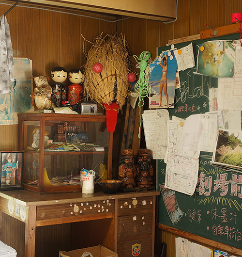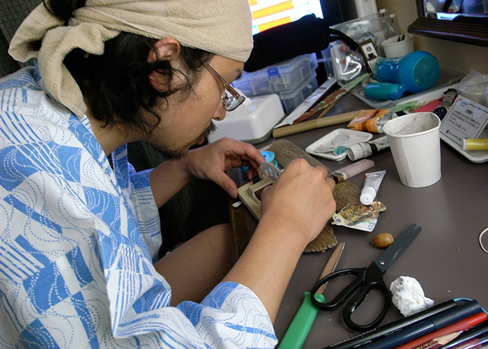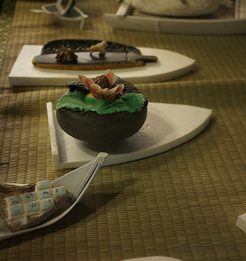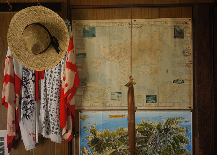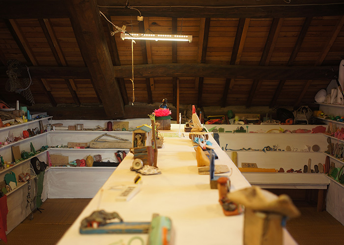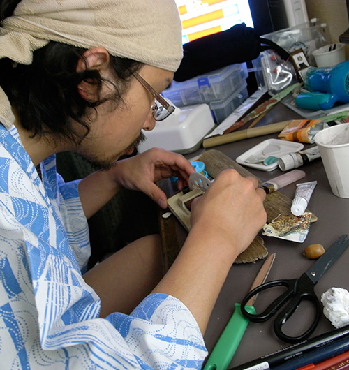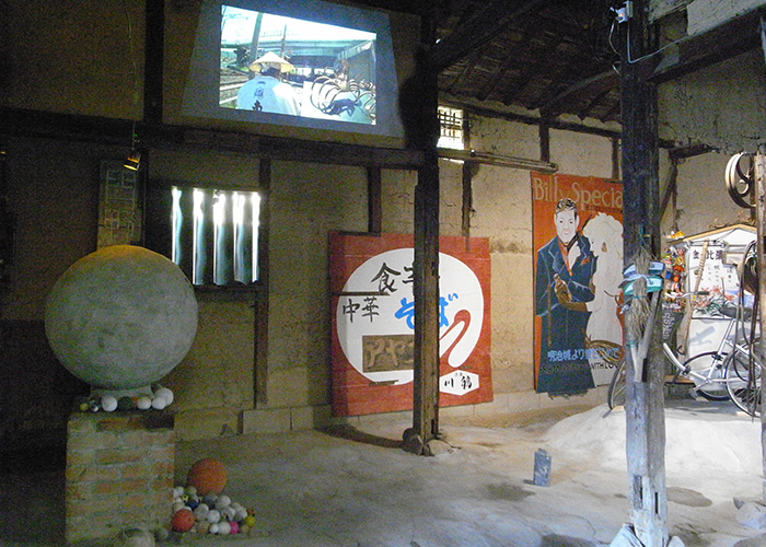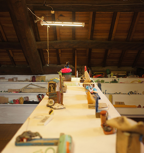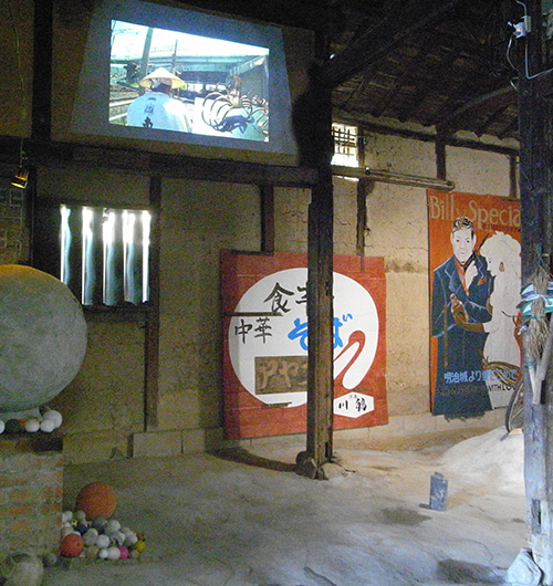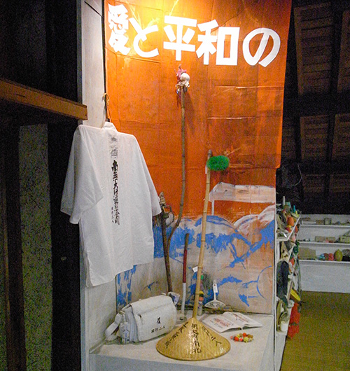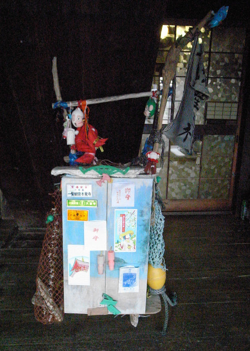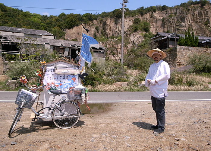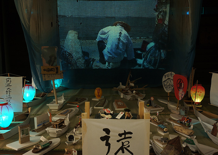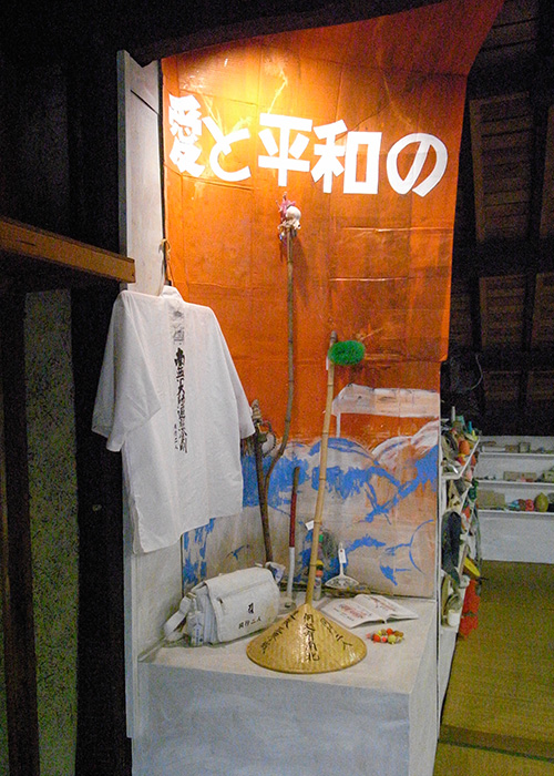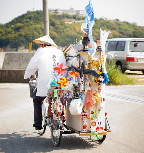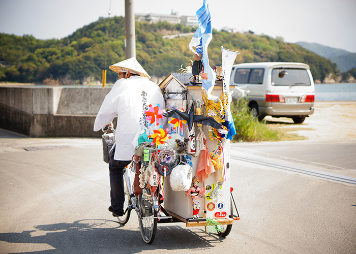 During the Pilgrimage to the seas and the mountains around Shikoku, I collected various kinds of things, and using them, made a lot of artworks like the minitures of the scenery which remains vividly in my mind. Takamatsu, Sakaide, Marugame, Tadotsu, Kanonji, Kotohira, Zentsuji and Yashima… The bike journey through these towns in Sanuki took 16 days. The pilgrimage round Shodoshima island took 8 days. A bicycle with a shed made by myself had been a good companion through my journey. Pilgrim wears such as “Shoiko”(wooden frame to carry things) were made of drifted things. Lots of scenery souvenirs and “Tokkosho” (a kind of Buddhist tool) I continued making in the inns. Together with all these things, I also showed video works, which recorded the whole journey and could exhibit a substantial installation.