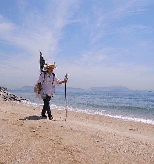 四国の海山を巡り漂着物など様々なものを拾い集め、記憶に鮮烈に残った光景を縮景のような作品をその場で制作しながら続いた巡礼の旅。高松、坂出、丸亀、多度津、観音寺、琴平、善通寺、屋島などの讃岐の町々を自作の小屋付き自転車で巡り、小豆島の島四国を漂着物で作った金剛杖、数珠、背負子、笈などの装束を身に纏い縮景作品を制作しながら巡礼した。遍路の伴侶となったのは自作の小屋付き自転車だった。旅先の宿で黙々と多くの風景土産を制作したり流木から独鈷杵を削り出すなどの記録映像も交えた作品である。